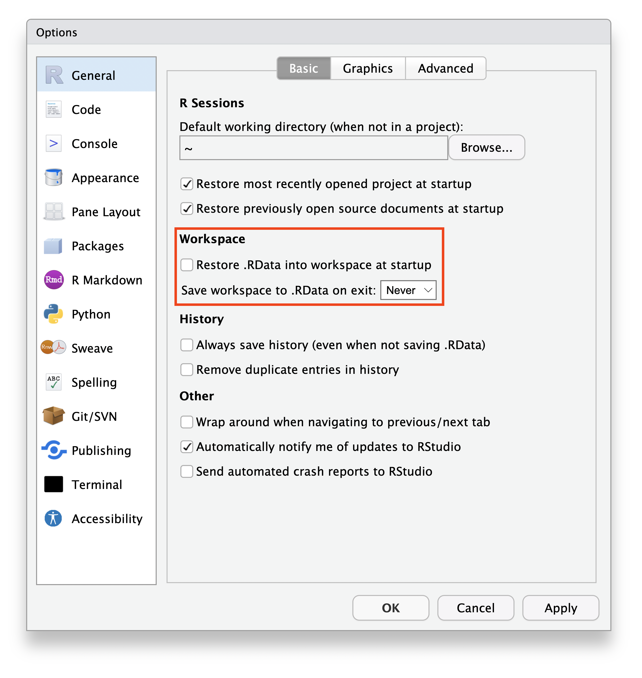 Turn off theautomatic saving of your workspace and .Rdata files with you quit RStudio. This is important for reproducibility, debugging, and avoiding littering your computer with unnecessary files.