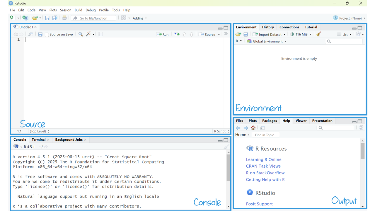 Source pane: where you can edit and save R scripts or author computational documents like Quarto and R Markdown.