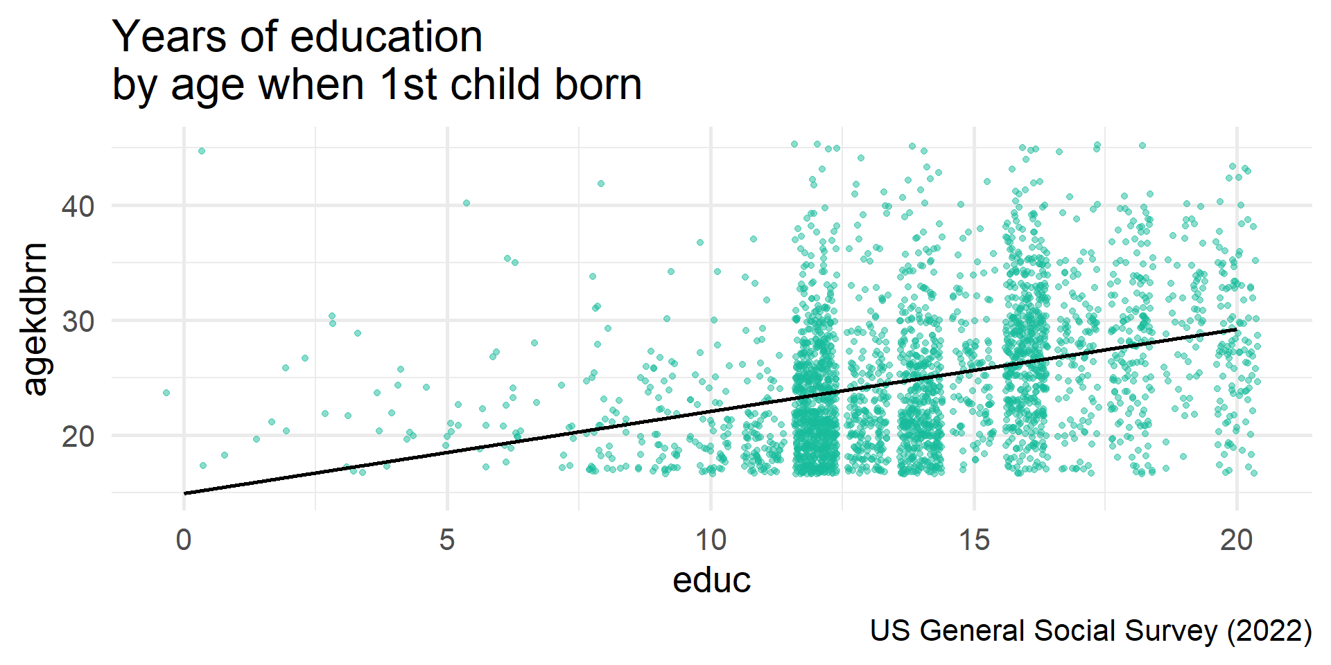 fefam Better for man to work, woman tend homepostlife Belief in life after deathlifenow R’s rating of life overall now from 0-10premarsx Sex before marriageagekdbrn R’s age when 1st child bornsex Respondents sexeduc Respondents highest edu creditage Age of respondentpolviews Think of self as liberal or conservativeMake a df with only the (pretty) categorical and continuous variables we’ll analyze.