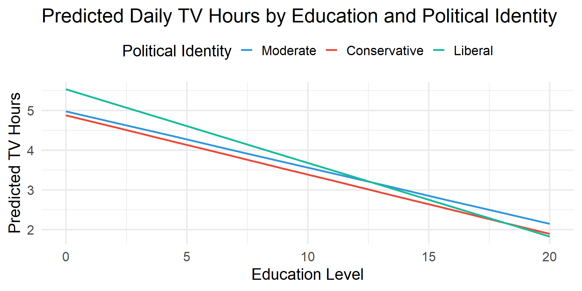title = "Predicted Daily TV Hours by Education and Political Identity",